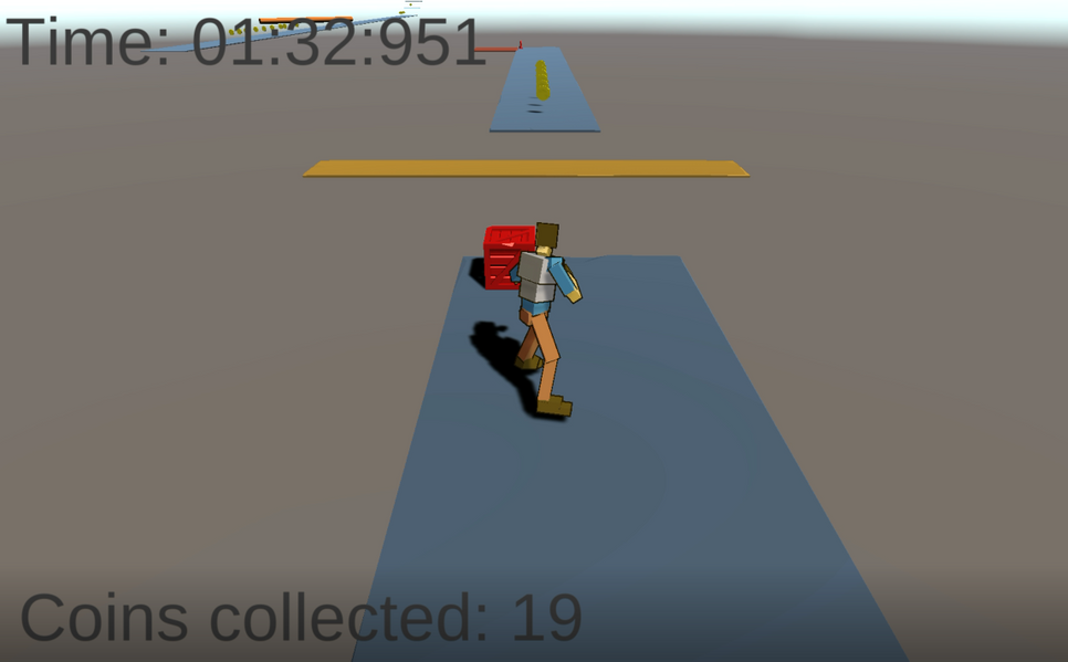 The player has to overcome the obstacles such as the rotating platform, moving platform and many more. They player has to collect 60 coins and has to reach to the end goal before the time runs out. If the player falls outside of the platforms or fails to collect all of thecoins within a limited amount of time, the game is over.